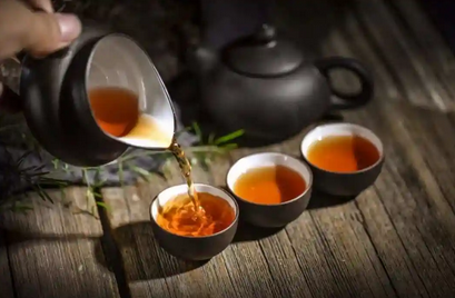 分茶:將茶海中的茶湯倒入每個茶杯中,按照個人口味和習慣,控制每個茶杯中的茶湯量。