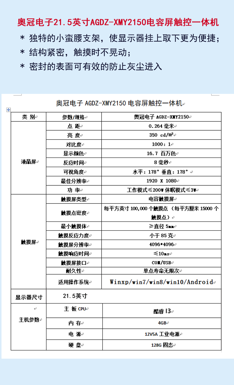 奧冠電子AGDZ-XMY2150電容屏觸控一體機